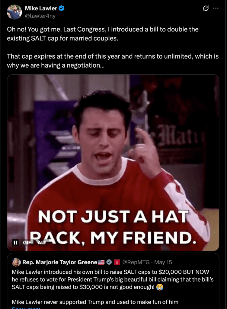 Lawler has been saying it for months: “I will not support any bill that does not adequately lift the cap on SALT.” House leadership has already offered to triple the cap to $30,000, but Lawler says that isn’t good enough, and is standing firm. He posted this on Friday: