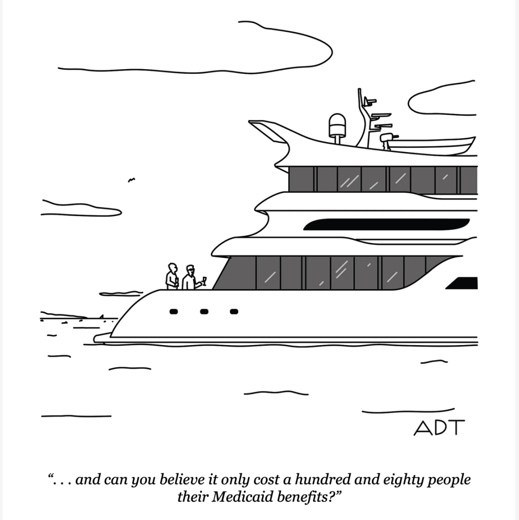 He also auditioned a new theme on Medicaid. Asked about reported cuts in the bill that might close rural hospitals and impact healthcare for millions, he responded: “The focus of the reforms in the bill is to slow the rate of growth and make sure that those who are not eligible do not receive benefits.” So, no cutting, just slowing the rate of growth. And of course we remember that Lawler’s ruse is to change the Medicaid eligibility requirements before ensuring that those who aren’t eligible don’t receive benefits.