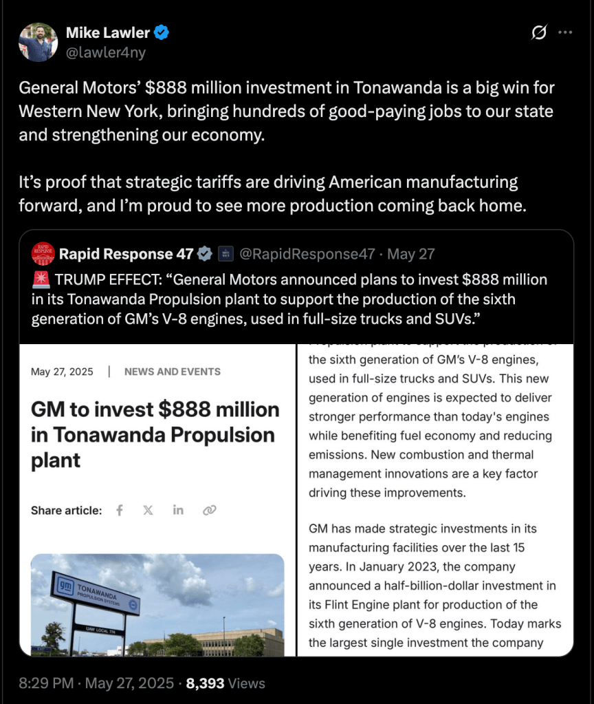 Note that GM announced a similar half-billion-dollar investment in its Flint, Michigan plant to produce the same engine in January 2023, well before the Golden One flipped the tariff switch. A decision to upgrade the Tonawanda plant for the production of the next generation V8, and protect a significant existing workforce, doesn’t necessarily sound like bringing jobs back home. Perhaps it’s “leveraging the footprint we have,” as GM says.