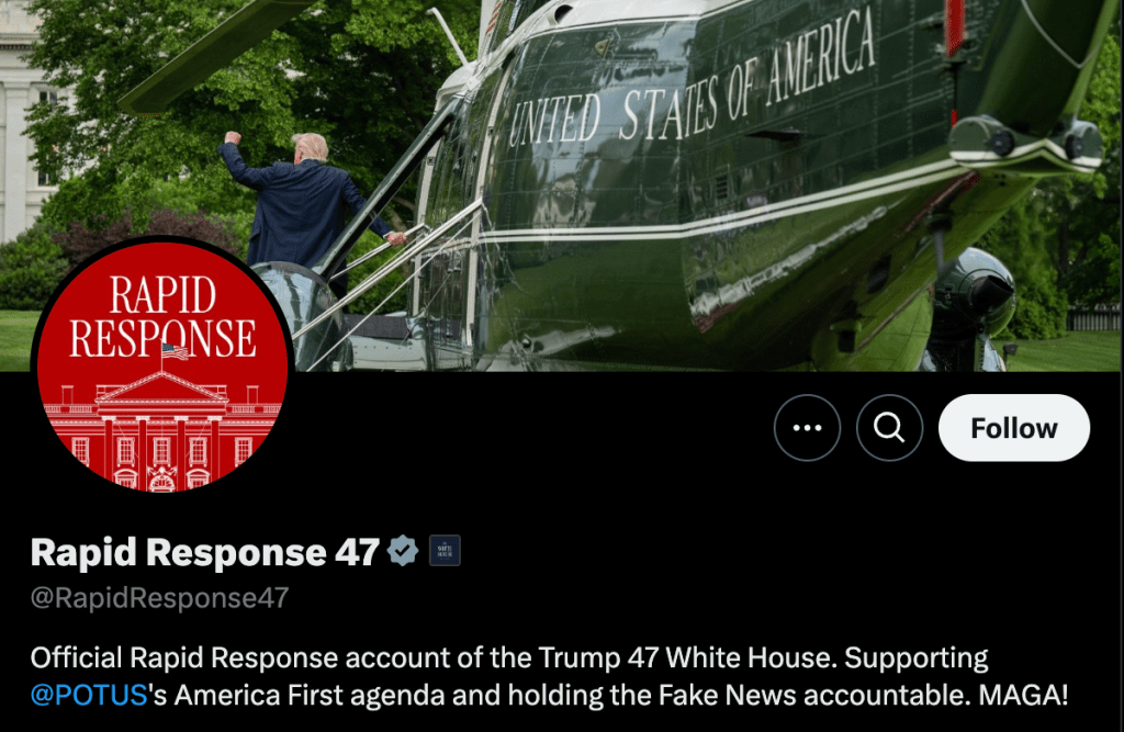 Hang on. Who is this “Rapid Response 47” being amplified by Mike Lawler? Oh, it’s the “Official Rapid Response account of the Trump 47 White House. Supporting @POTUS‘s America First agenda and holding the Fake News accountable. MAGA!” Of course Mike Lawler is a Follower.