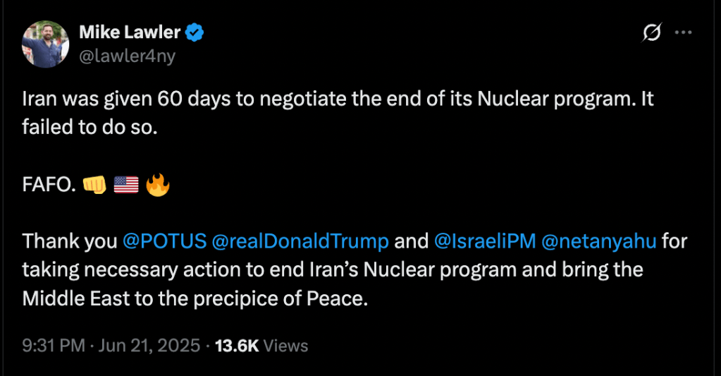 There’s so much to say about Trump’s decision to bomb Iran’s nuclear facilities. Mike Lawler said this: