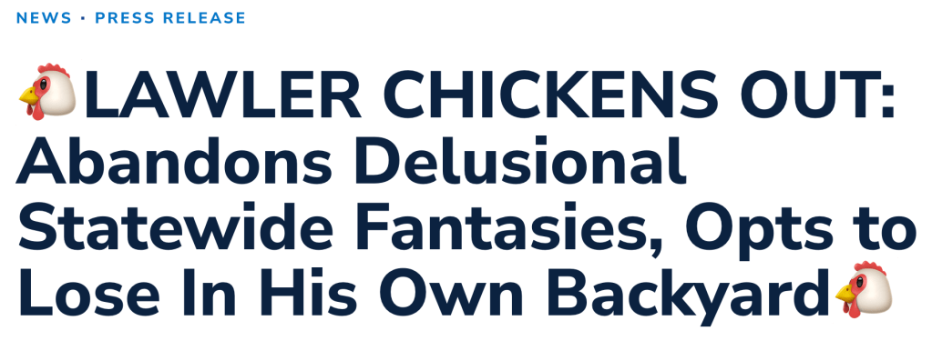 Lawler was back in the Principal’s office last week, where they “had a wholesome discussion” about his ambitions, as recounted by Lawler. Which means Trump told him what to do or else. And once again, we see Mike Lawler bend the knee as “a true America First Patriot,” giving up his gubernatorial dreams.