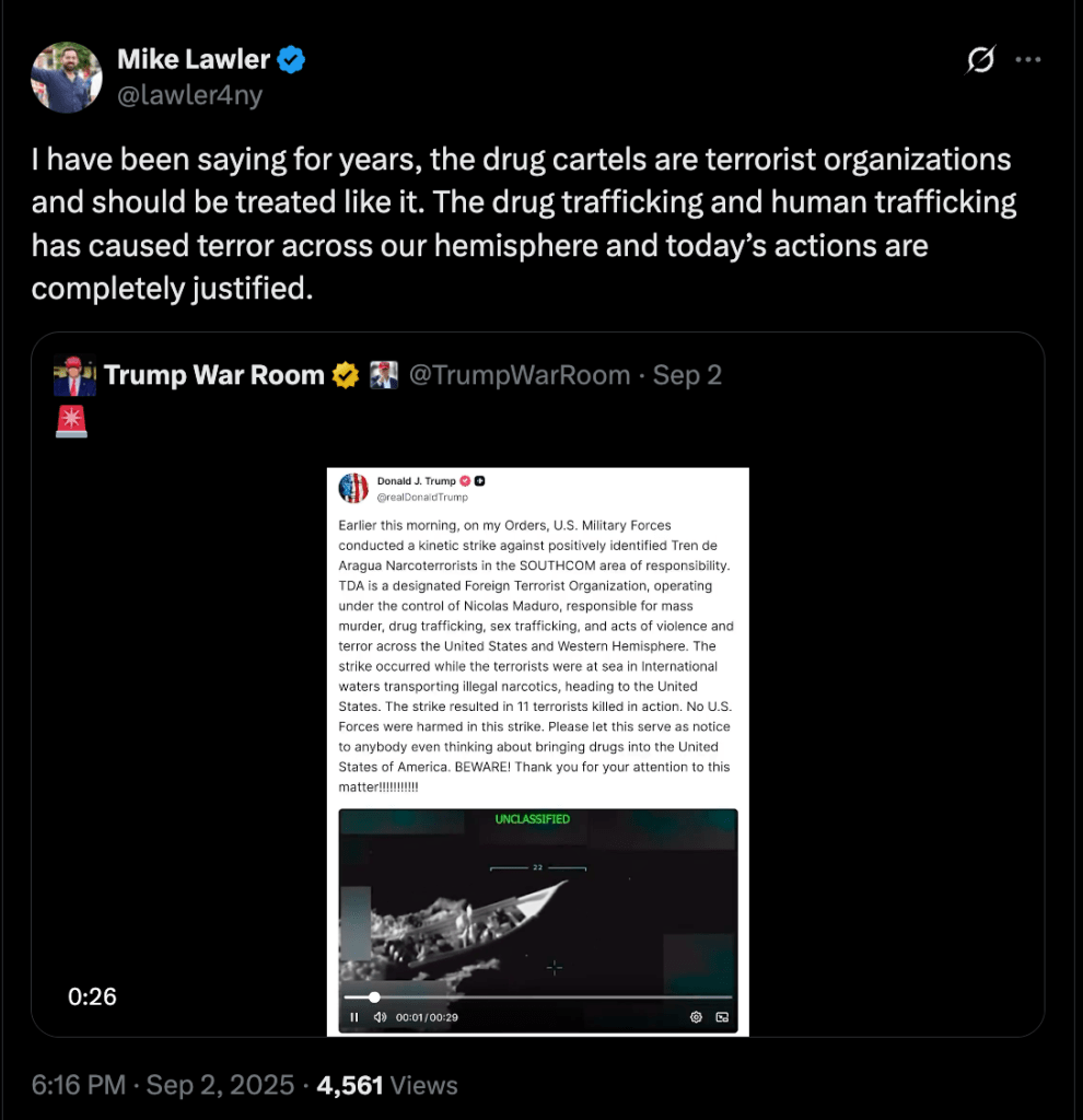 “The United States doesn’t really have the capability to develop good intelligence about these embarkations,” he said. “You don’t just send a missile and destroy a boat. It is the equivalent of a police officer walking up to a drug trafficker on the street and shooting him.”