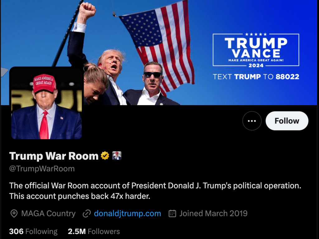 I think it should worry us that our Representative in Congress finds time to follow the Trump War Room: “The official War Room account of President Donald J. Trump’s political operation. This account punches back 47x harder.” A site that puts out thoughtful analysis like this: