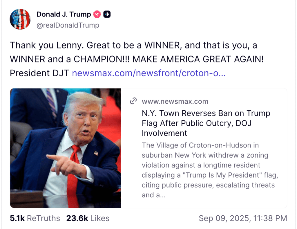 The issue simmered for a few years. Then in July of this year, the village issued a citation to Amicola for flying a prohibited banner on his property, in violation of the local code. It didn’t take long for Mad Max NEWSMAX to fan the flames nationally, hyperventilating, “A Democrat stronghold in the New York City suburbs is trying to force a property owner to remove a pro-Trump flag.” Before they could draw another breath, the village faced threats of violence and a Department of Justice investigation. So they reversed their decision pending further review.