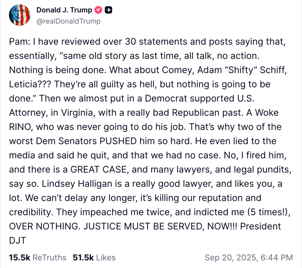 - Trump Demands That Bondi Move ‘Now’ to Prosecute Foes